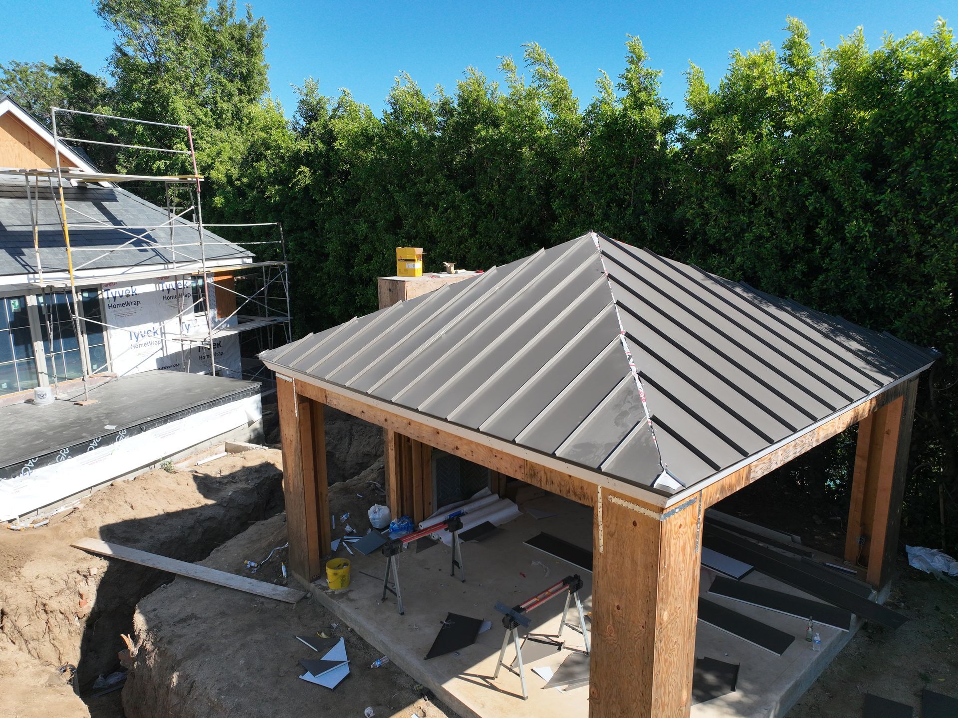 Let's talk a walk from one building to the next via your new metal roof and overhang.
