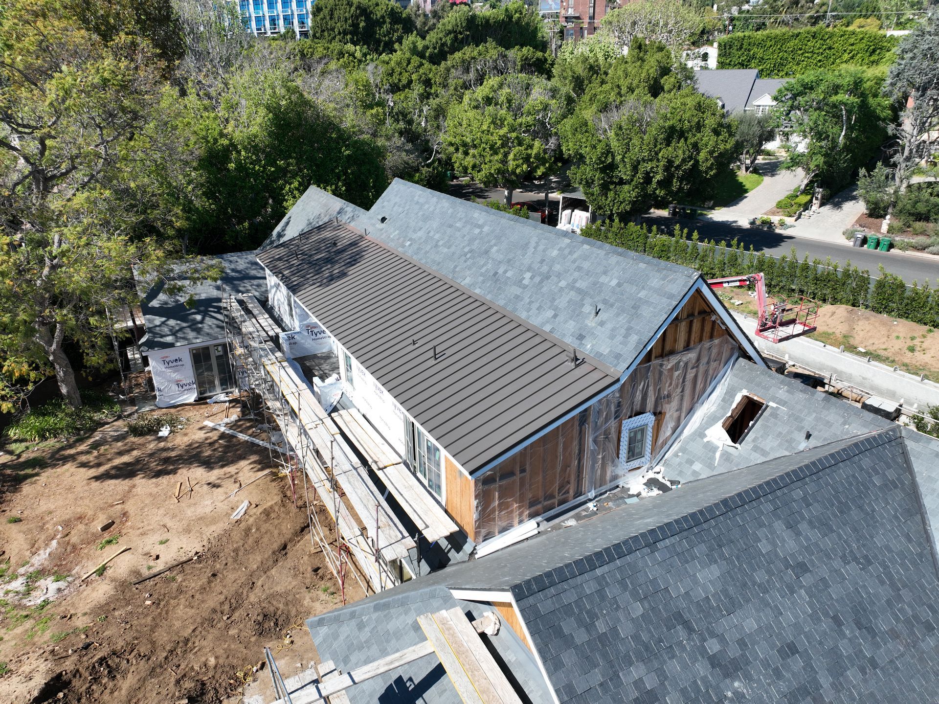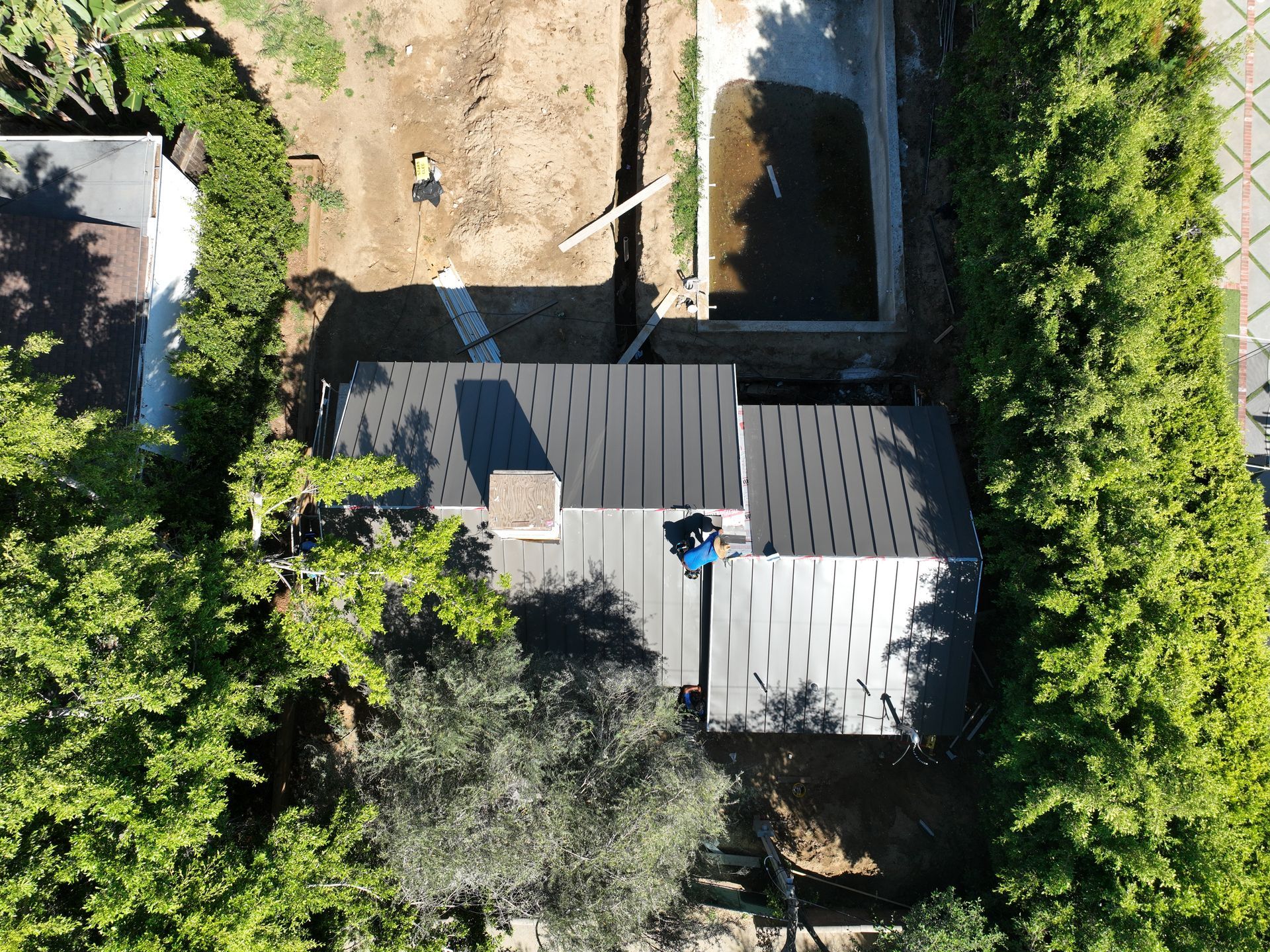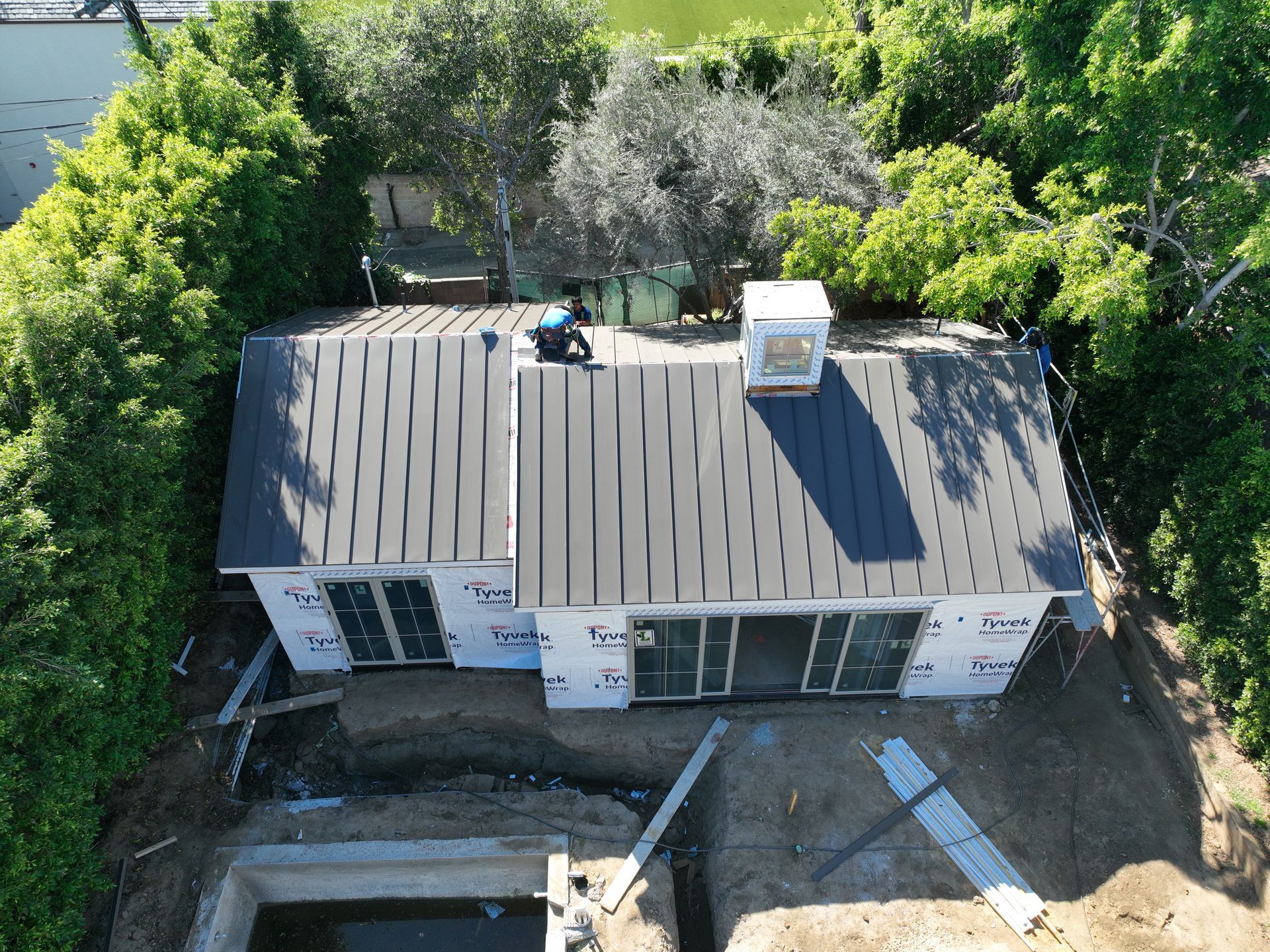 Not a bird, but our drone shows our team hard at work installing this metal roof and staying safe.